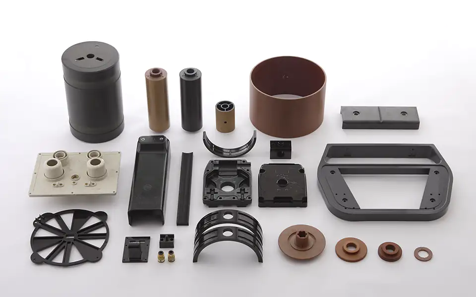 基材の生産に始まる社歴は、そのまま直圧成型プラスチックと対峙する60年であったと言うことができます。社内開発による基材をもとに、直圧成型のための材料を吟味、生産し、直圧でしか成型できない熱硬化性樹脂成型品(フェノール樹脂等)を、確かな品質で世に送り出すことが、私たちの誇りであり社会的使命であると考えます。